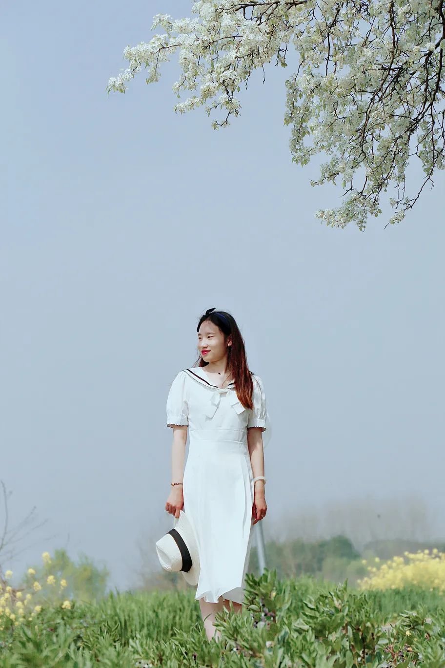 素雅洁白的花朵映衬着黄澄澄的油菜花,